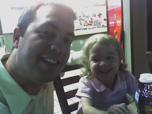 Last night after church, Abby Kate and I had a date. Joshua stayed home with Mommy (he had a pretty bad cough), so it was just the two of us at church. I let her pick the restaurant and, like any good red-blooded American kid, she chose McDonalds. It’s like it’s hardwired into their DNA or something. We had a sumptuous feast of chicken nuggets and french fries. Abby Kate was especially proud of the chocolate milk Daddy got her.