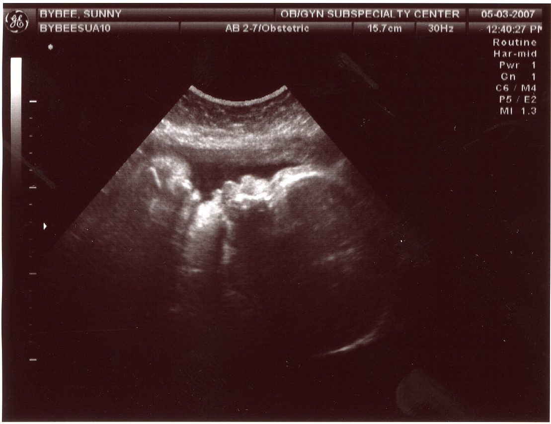 Jamey, it’s just a normal ultrasound picture. It’s really good, isn’t it? I normally can’t make out what’s what in those pics, but this one is pretty clear.I hope you guys have a better time picking out a name than we have. Do you know what you’re having yet? Or is it too early?Lane, one of the names we bandied around was a baseball name. You would’ve liked it for sure.Mike, the abudance of “B”‘s in my last name pretty much precludes any Billys or Bobbys. Although you have to admit, Billy Bob Bybee is a pretty cool name.