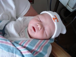 The hat is a nice touch, that’s for sure. Mom and baby are asleep in the hospital room right now. This go round has been so different from our experience with Abby Kate and Joshua. Much more “normal”, I guess.Joshua and Abby Kate will be coming in a few hours to see their new little brother. I know they’re excited! I am too!