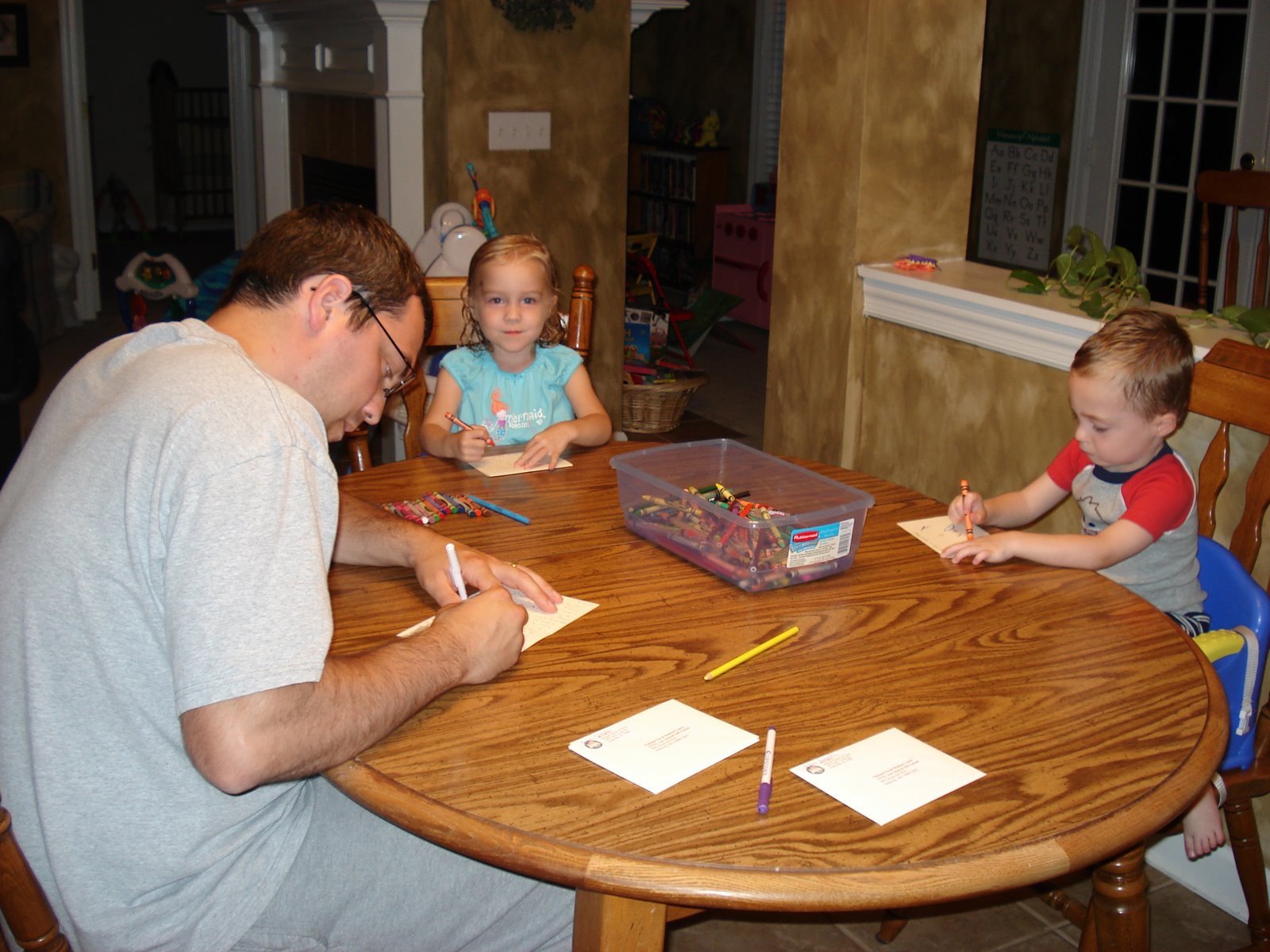 Tonight, Sunny and I did a little project with the kids. One of the ministries our church is involved in is sending encouraging notes and cards to the men and women of the United States Armed Services. Sunny picked us up several cards and envelopes and tonight we spent some time writing to our men and women of the military. The letters we wrote will go directly to an injured OIF Patient at the National Naval Medical Center in Bethesda, Maryland. We thought this would be something good for the kids to participate in, so here’s a pic of Joshua and Abby Kate eagerly decorating their cards.