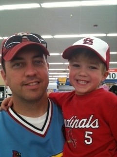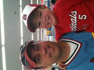 Tonight’s game was especially fun because our youngest little Card fan was more “into” this game than any of the previous ones he’d attended. When we arrived at the stadium, he immediately wanted me to show him the statue of “Alvert Pujols”. (Funny how he mispronounced his first name.) Earlier in the day, he decided he really wanted his very own Cards hat, so we obliged him and for the first time ever, the little man kept his hat on for more than 5 minutes. In fact, he wore it all day long…in part to keep the blazing sun at bay, but also, I believe, because his old man was wearing his hat. A proud moment indeed.