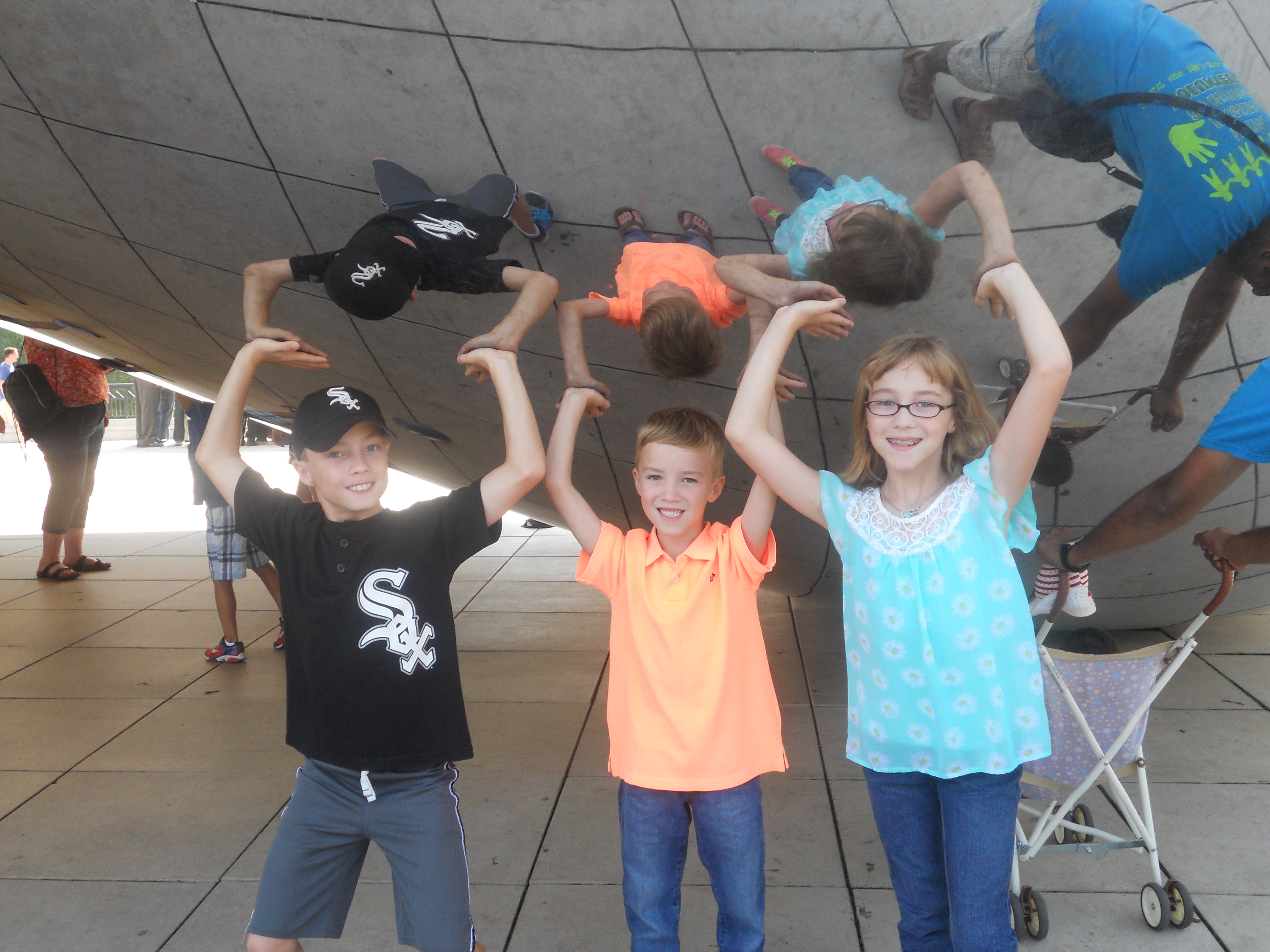 Following our late lunch, we took the L back to downtown. The kids loved being able to see the city from the windows. After a short ride, we were in the middle of downtown touring Millennium Park. The kids loved seeing all the unique artwork, particularly the famous “bean.” As you can see, we took several silly pics!