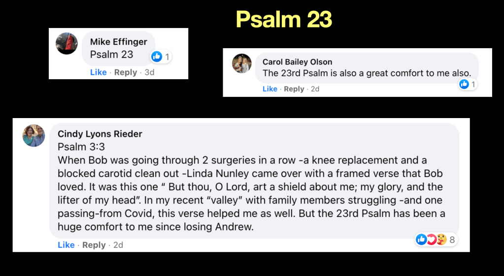 Unsurprisingly, Psalm 23 was one of the passages my friends mentioned the most. For thousands of years, David’s words have brought comfort to God’s people. I was especially moved by what my friend Cindy wrote. She and her husband, Bob, have served in our church family for many years. Cindy spent most of her comment talking about another passage, but before she closed, she mentioned the 23rd Psalm, saying that it “has been a huge comfort to me since losing Andrew.” Cindy and Bob lost their son over 7 years ago. Cindy also lost her parents when she was very young. So when she talks about being comforted in her grief, I listen up. And she says, “This word from God has brought me so much comfort.”