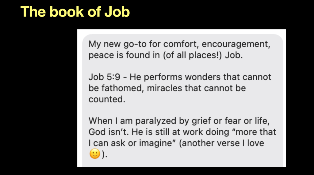 Unexpectedly, several of my friends mentioned that the book of Job brought them a special sense of comfort. One of my friends mentioned Job 5:9, He performs wonders that cannot be fathomed, miracles that cannot be counted. She says, “When I’m paralyzed by grief or life, God isn’t. He is still at work doing ‘more than I can ask or imagine.'”