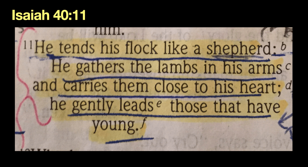 One of our elders, Denton, texted me this picture. It’s Isaiah 40:11 taken from the Bible of Paul Kelly. Paul was one of our shepherds at Mayfair for many, many years. He passed away nearly six years ago. Denton told me he went over to visit Susan after Paul had passed away and Paul’s Bible was opened to this passage. As you can see it’s been highlighted and underlined many times. He tends his flock like a shepherd; He gathers the lambs in his arms and carries them close to his heart; he gently leads those that have young. I think you’d be hard pressed to find a better description of the heart of Paul (and Denton). I know these two shepherds to have hearts that have been shaped by the Master Shepherd, the One who carries all of us close to His heart.