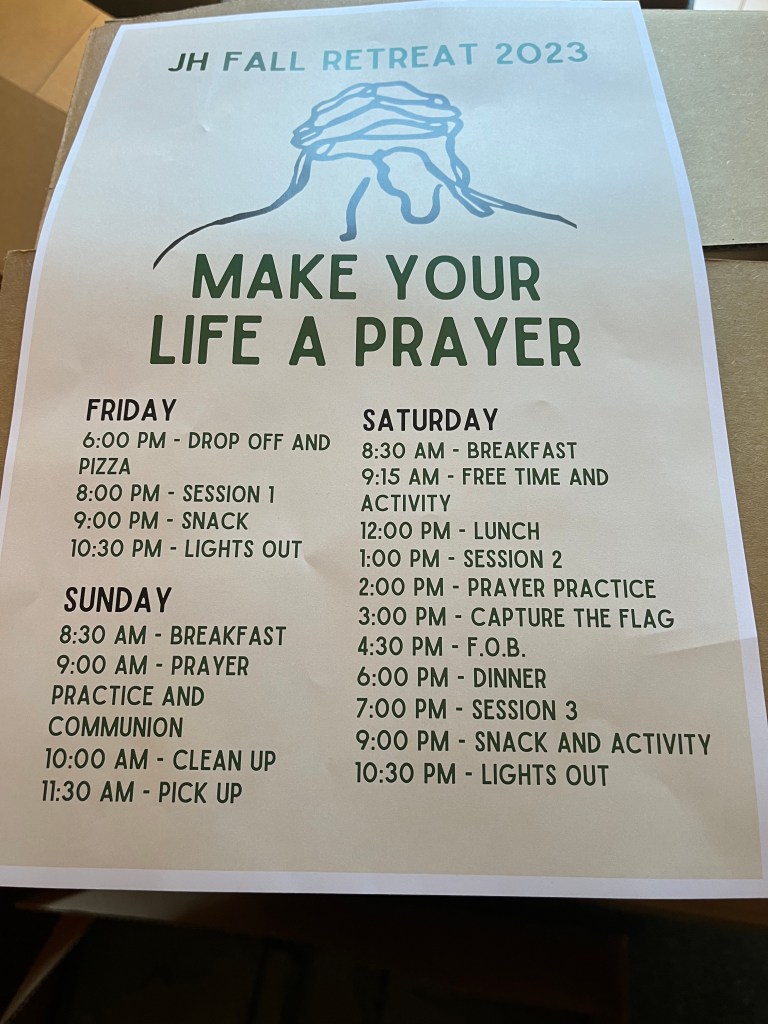 I had the opportunity recently to speak at our Middle School Fall Retreat. From my youth ministry days, fall retreat was always my favorite event. And I have to say, it was a real blessing to me to be able to spend some time with so many of our students who were so interested in learning about prayer. There is much in the world that may be disheartening, but these young people and their hunger for the Lord renews my hope.