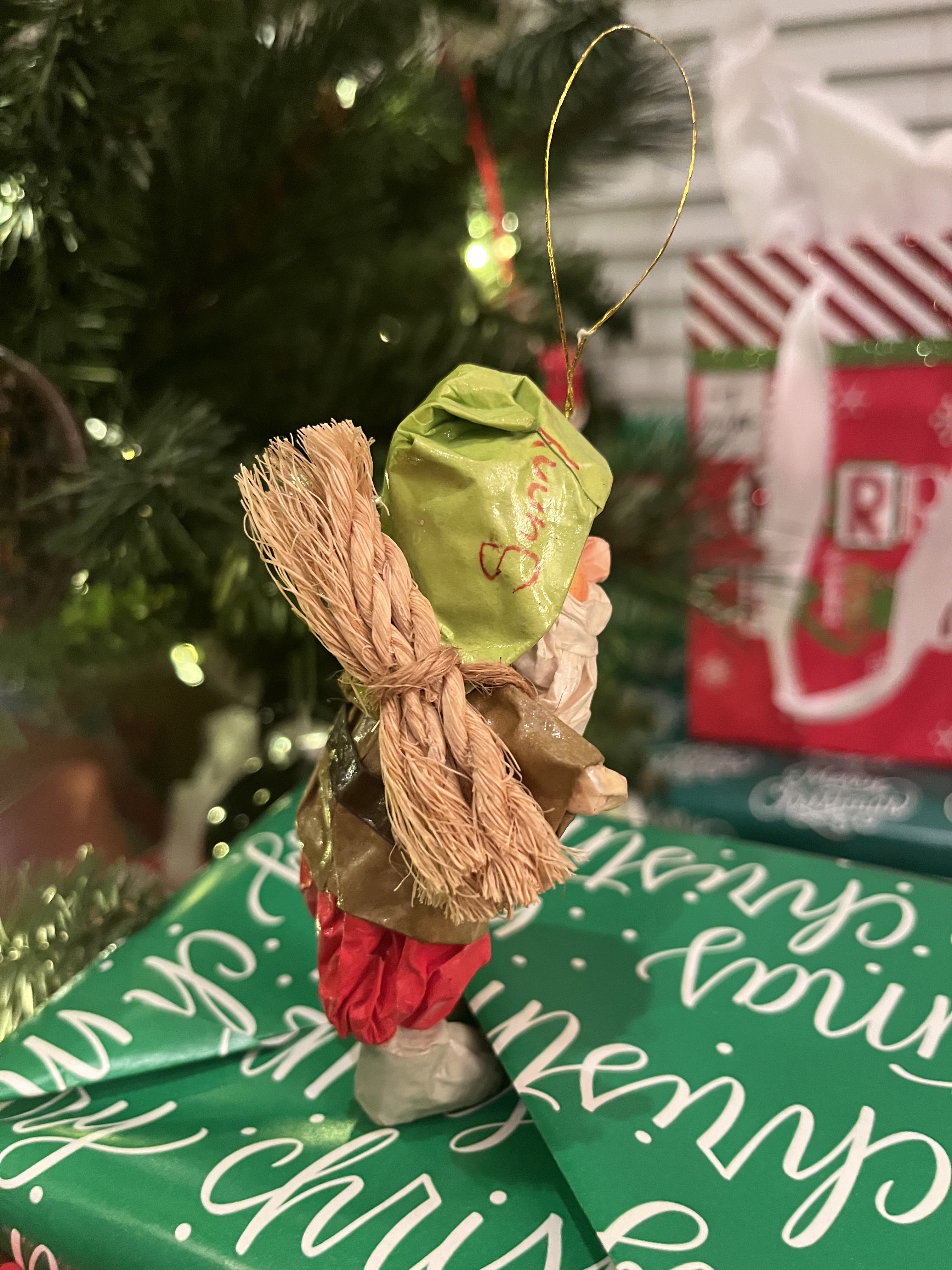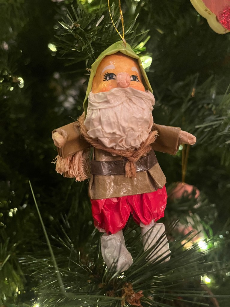 Sunny has had this ornament since childhood. There’s no sentimental backstory to this ornament, at least not one that she can remember. She has no idea how she ended up with this ornament, but she’s always had it. I think he’s supposed to be Santa — except for the fact that he’s wearing a green hat and he’s carrying a yoga mat on his back or something. Others say he’s a gnome. Either way, I think he’s ugly.